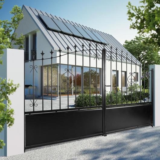 Portail livré avec les accessoires: verrou/ serrure/ poignée/ gonds/ sabit central/ crapaudine/ couvre-joint